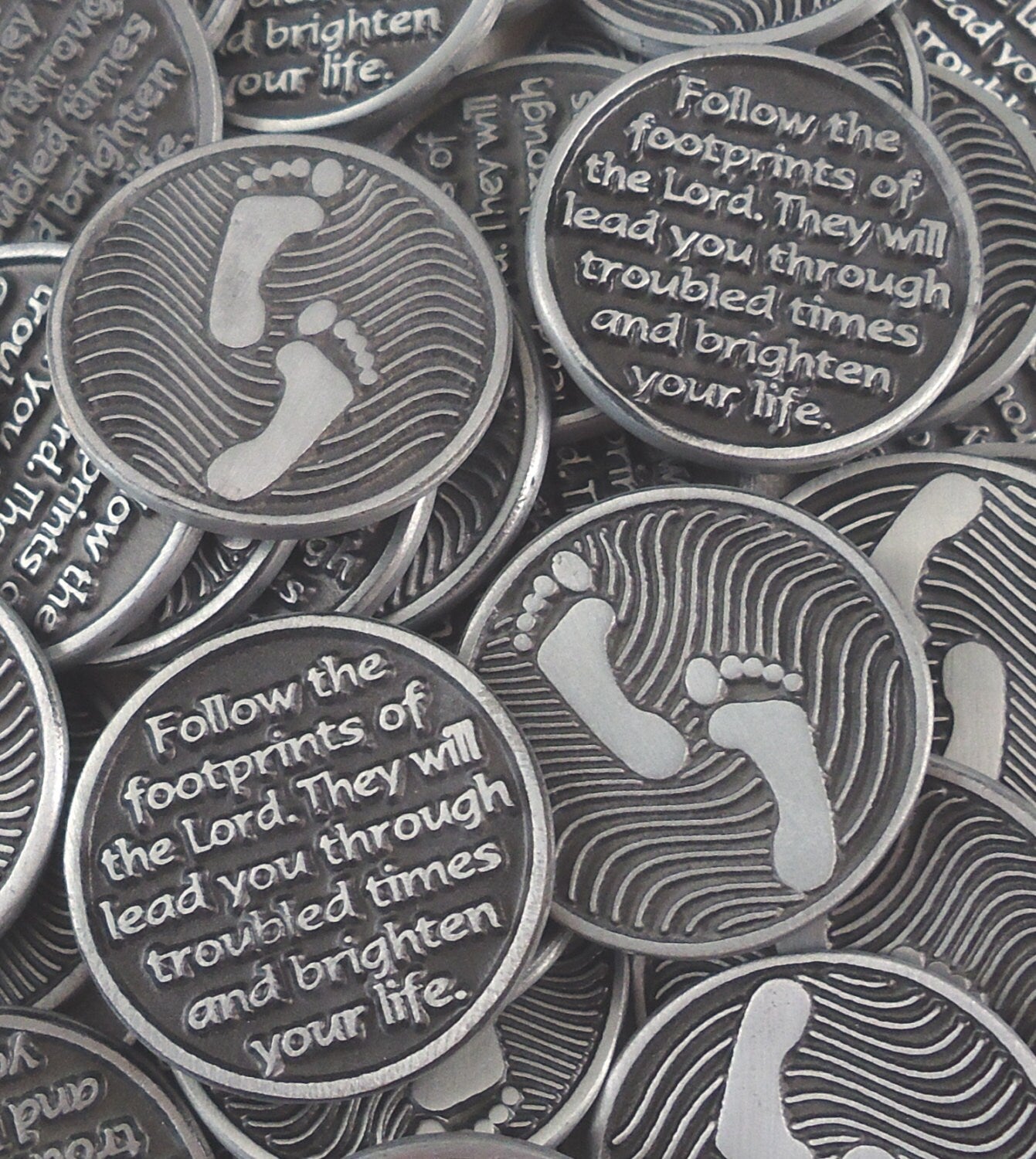 Footprints Pocket Tokens are made of lead free zinc. Pocket Tokens measure approx. 1" in diameter.