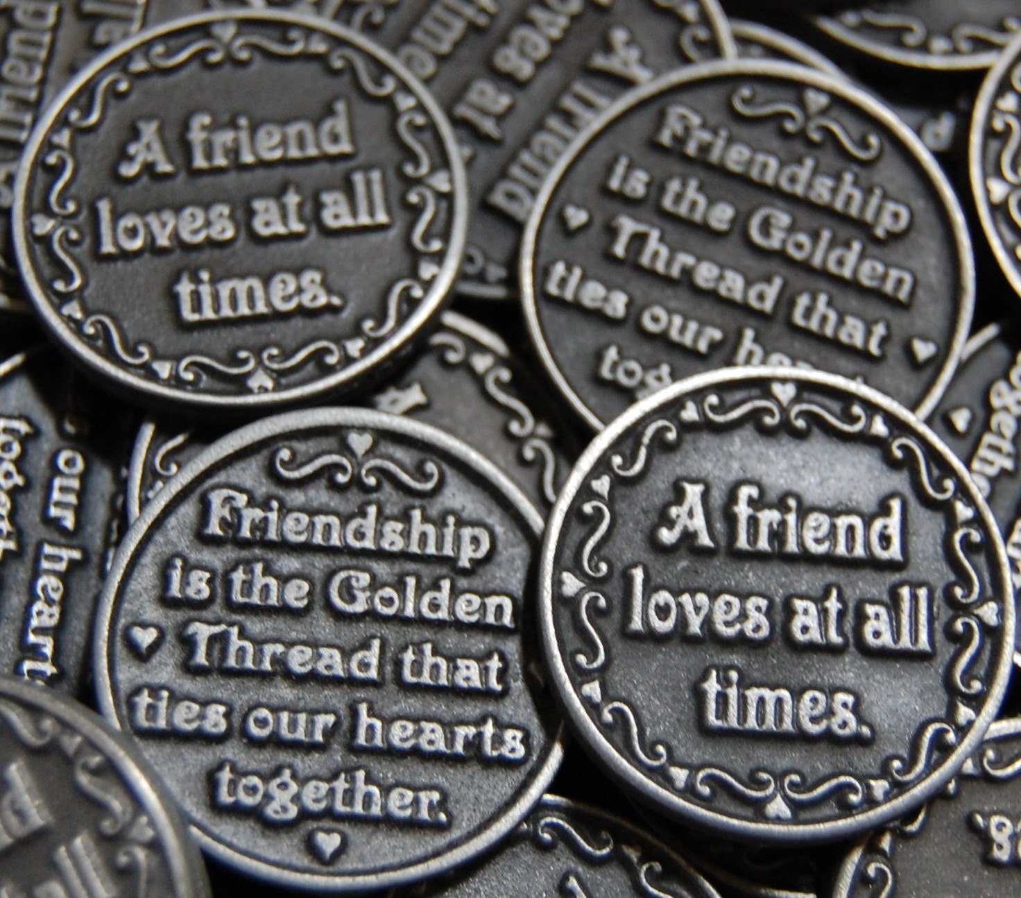 Friendship Pocket Tokens are made of lead free zinc. Pocket Tokens measure approx. 1" in diameter.