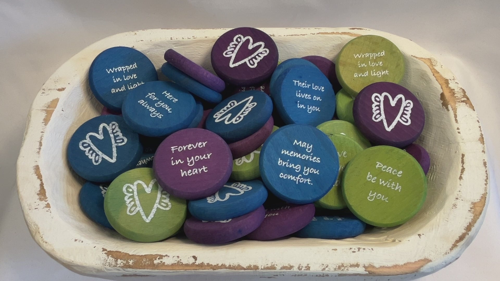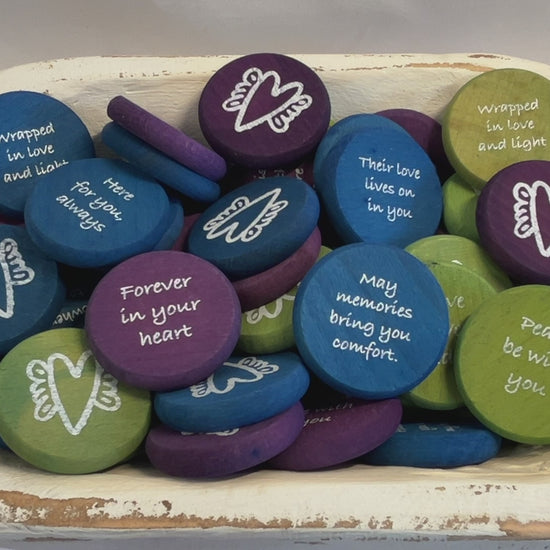 Grief and Support Wood Coins Tokens measure approximately 1 1/2" in diameter and are 1/4' thick. Imprinted with support and healing phrases and heartwing imagery on the reverse of each they come in a variety of colors and styles. The mix will come with an assortment of the following: