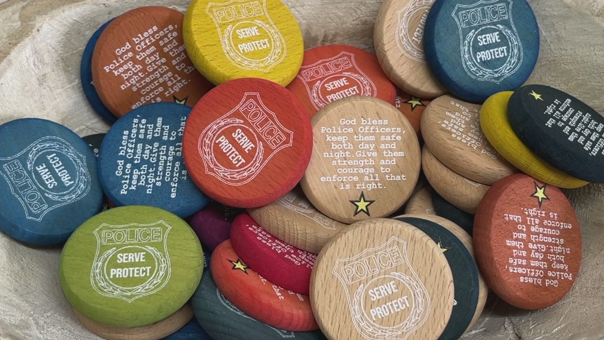 Front: Police Serve Protect (police shield) Back: God bless Police Officers, keep them safe both day and night. Give them strength and courage to enforce all that is right. (star)