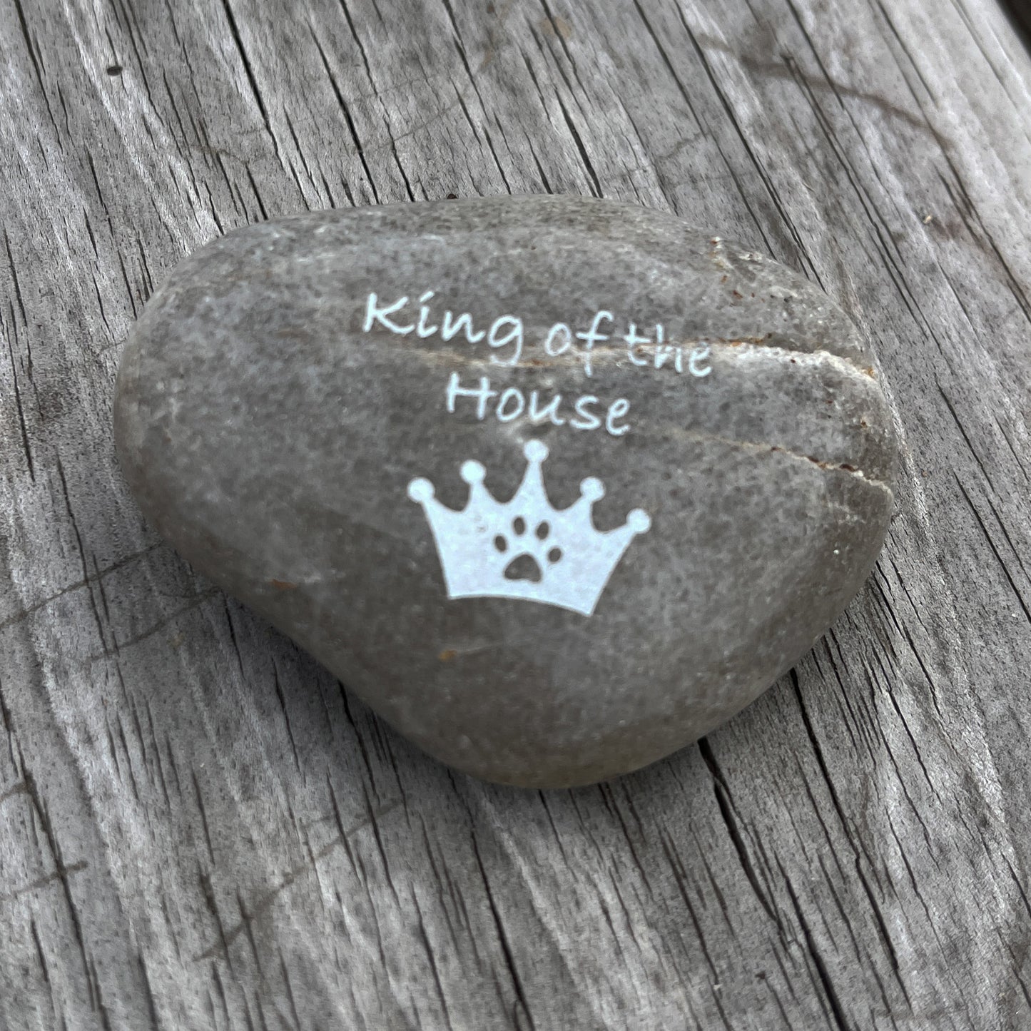 King of the House (crown with pawprint)- Engraved River Rock Pet Memento Word Stones range in size from 1 1/2" - 3 1/2".