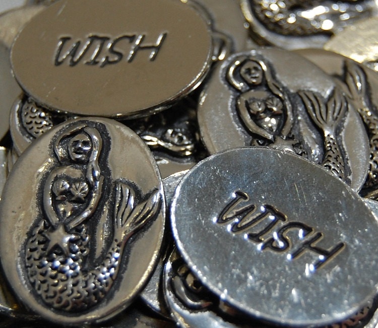 Mermaid Wish Inspiration Coins are deeply engraved and are made of lead free pewter. Inspiration Coins measure approx. 3/4" x 1/2". The tokens are sold individually and can be used to create party favors, meditation and healing tools, gifts, wedding favors and good luck charms. The token you will receive is double sided with a mermaid pictured on the front and the word 'Wish' on the back. (