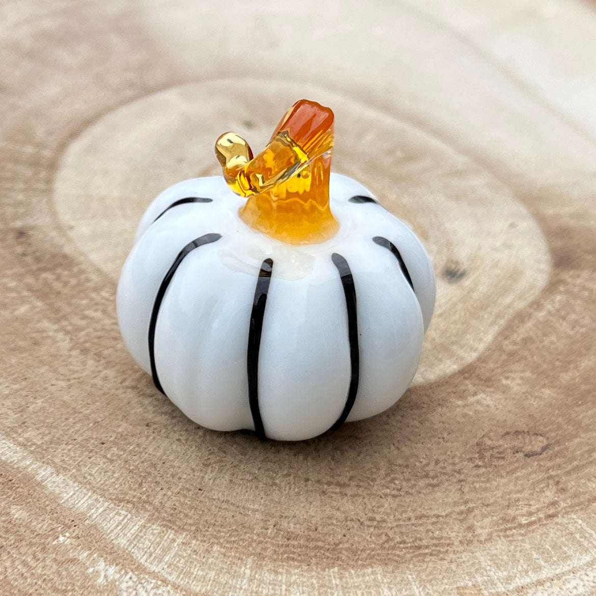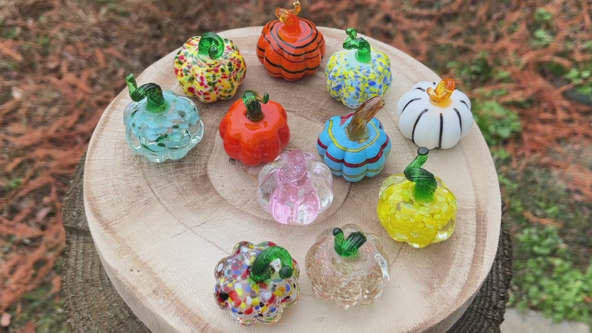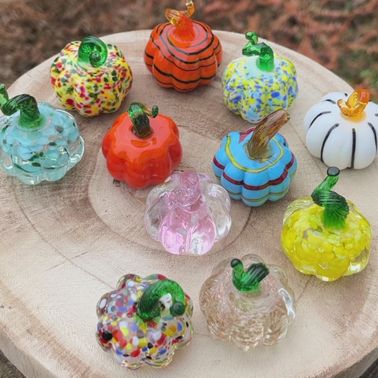 Adorable miniature Glass Pumpkin sitter figurine collectible measures 1 1/4" x 1 1/4" x 1 3/4". Pumpkins have swirls and bursts of color.