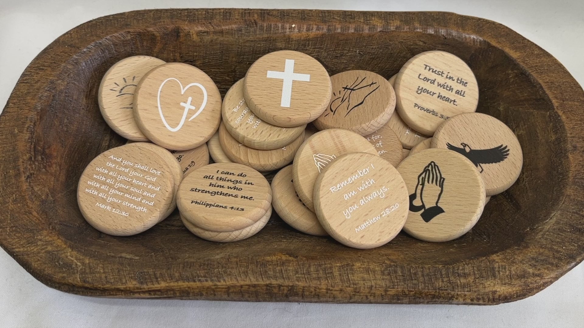 Scripture Wood coin tokens measure approximately 1 1/2" in diameter and are 1/4" thick. Imprinted with a scripture verse on one side and an image on the reverse in white and black ink.
